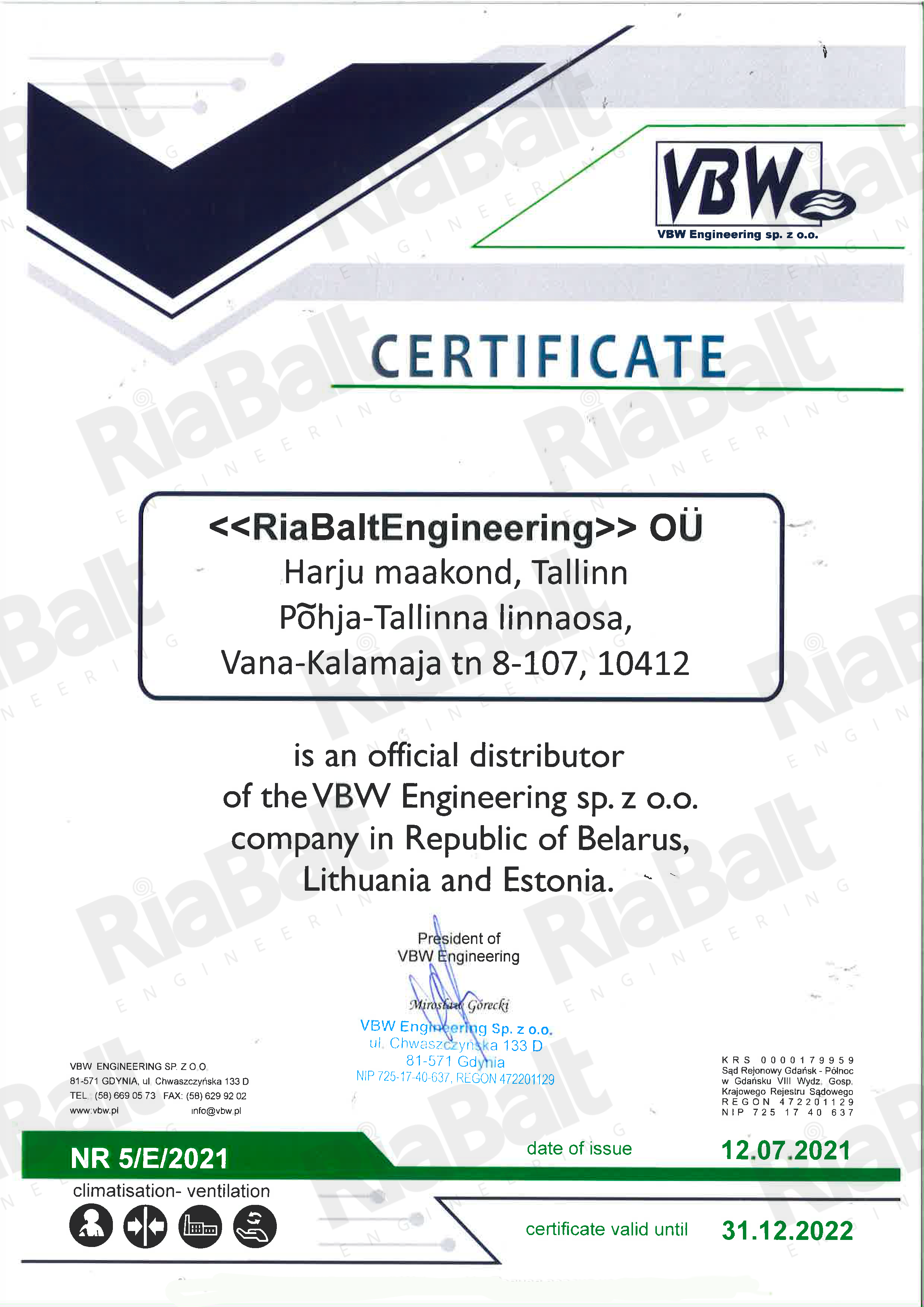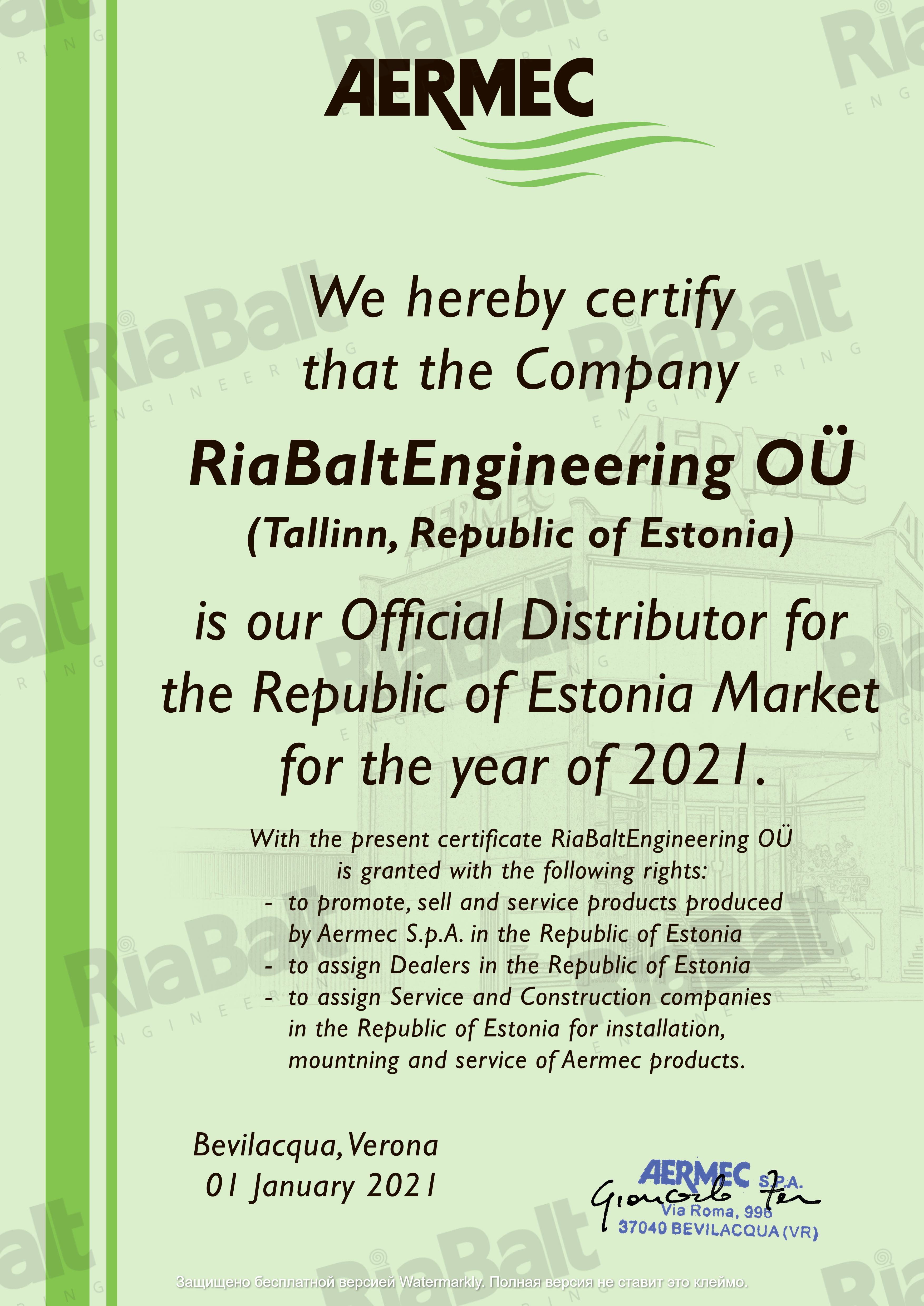 Eesti territooriumil on RiaBaltEngineering OÜ ainumüüja Aermec S.p.A (Itaalia) toodangule ja turustaja VBW Engineering Sp. z o.o. (Poola).